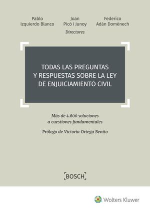 Aquí el lector encontrará más 4.600 preguntas y respuestas fundamentadas, todas ellas sistematizadas en base a los artículos de la LEC con los que están conexas, lo que facilita en gran medida la rápida localización de la cuestión que pueda resultar de su interés: ¿Qué ocurre cuando en una resolución judicial o procesal no se indica el plazo para recurrir; el que se indica es erróneo o se concede un plazo incorrecto para una determinada actuación procesal?; ¿Qué relación hay entre la mala fe procesal y el retraso desleal en el ejercicio de las acciones?; ¿Es suficiente una simple hoja manuscrita reconociendo una deuda?; ¿Qué sucede cuando hay pluralidad de reclamados en el pago monitorio y una se opone y el otro no?; ¿Puede el actor, en el declarativo posterior, añadir otras reclamaciones diferentes de la que constituyó su petición monitoria?; ¿Es suficiente la remisión por burofax para notificación extrajudicial del saldo al deudor cuando éste no atiende el requerimiento de correos?